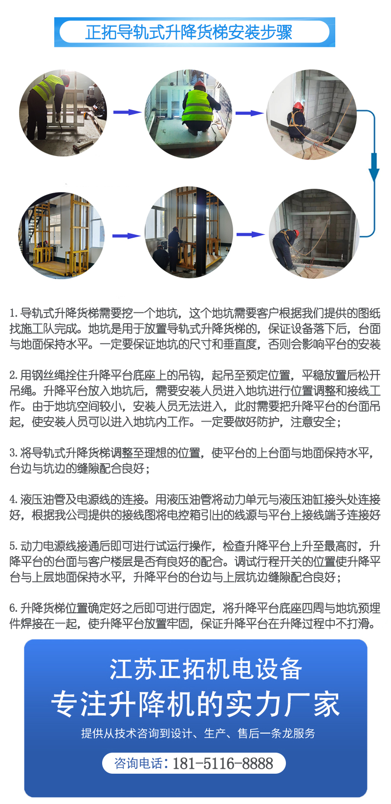 1.導軌式升(shēng)降(jiàng)貨梯需要挖(wā)一個地坑,這個地坑(kēng)需要客戶(hù)根據我(wǒ)們提供的(de)圖紙,找施工隊完成。地坑(kēng)是用於放置導軌式升降貨梯的,保證設備落下(xià)後(hòu),台麵與地麵保持水平(píng)。一定(dìng)要保證地坑的尺寸和垂直度,否則會影響平台的(de)安裝;